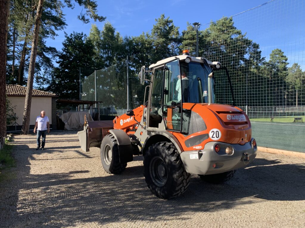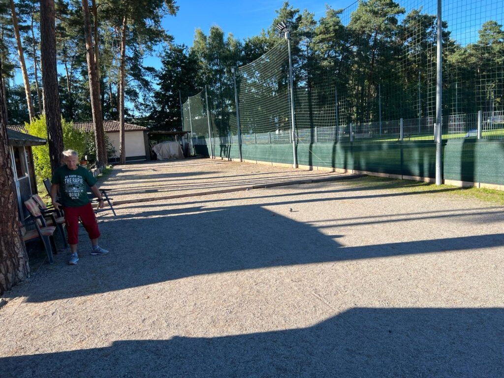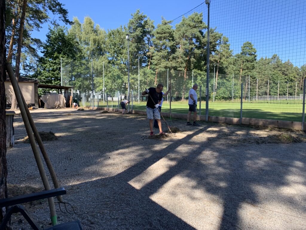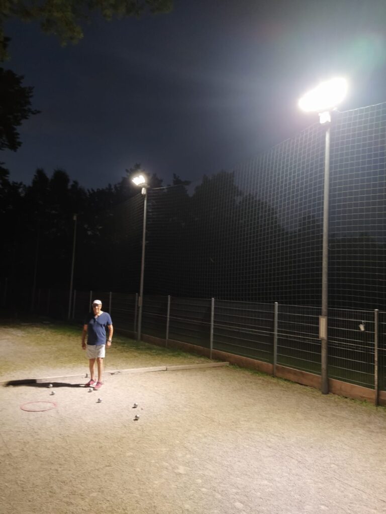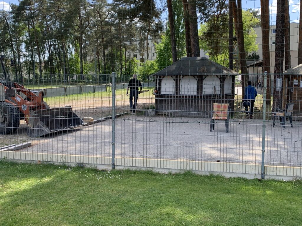 So oder ähnlich hätte man die Situation beschreiben können. Jedenfalls sproß das Unkraut bei uns am Boulodrome nur so in die Höhe. Die alten Rundhölzer als Abtrennung zum Fußballplatz waren fast schon weggefault oder zumindest vermodert und ein Austausch war dringend notwendig. Genauso wie eine moderne LED-Beleuchtung, auf die wir schon sehr lange gewartet haben. Dazu wollten wir einen Sichtschutz auf der ganzen Länge anbringen, um eine bessere optische Trennung zu haben und evtl. den einen oder anderen Grassamen abzuhalten.