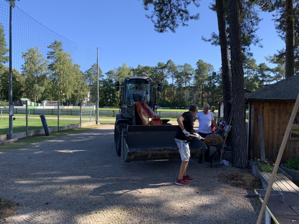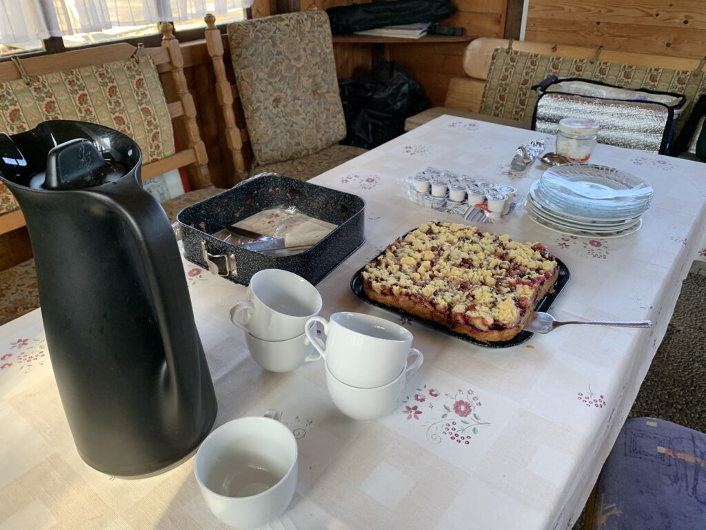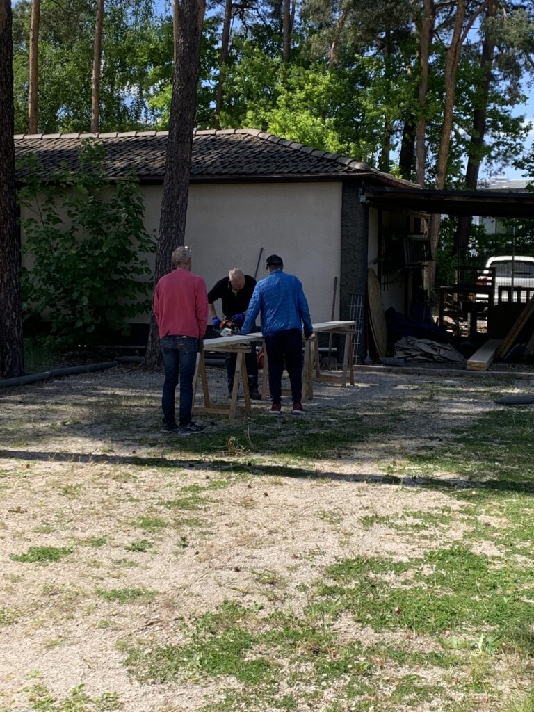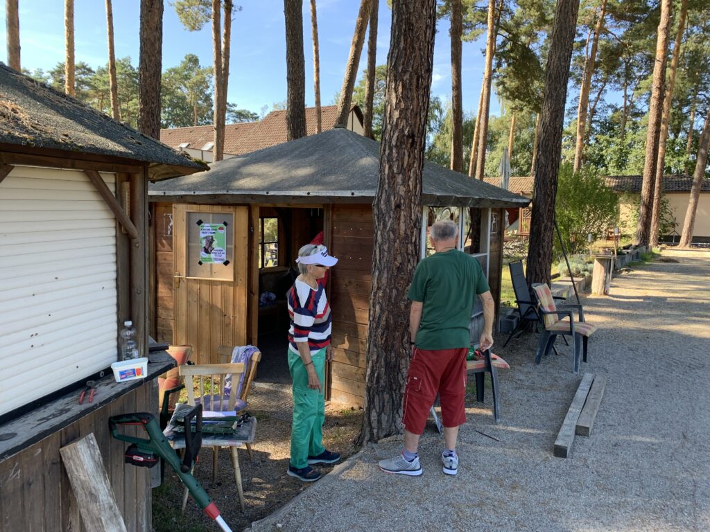 Als letzten Schritt wurde das Unkraut mit schwerem Gerät und sehr viel manueller Arbeit auf den beiden hinteren Bahnen bekämpft und der Sichtschutz angebracht. Natürlich wurde dabei auch die Hütte ausgiebig gereinigt – gab es hier doch anschließend Zwetschenkuchen und Kaffee als Belohnung.