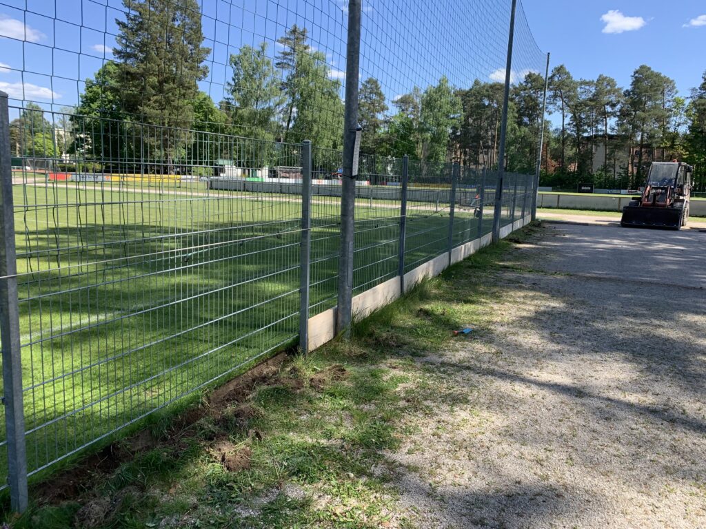 In mehreren Etappen wurde das Projekt angegangen, denn unsere drei Spielfelder sind etwa 38 m lang und Eigenleistung war angesagt. Zuerst haben wir die Rundhölzer ausgegraben, dicke Holzbohlen zugeschnitten und diese dann vor den Zaun gesetzt.